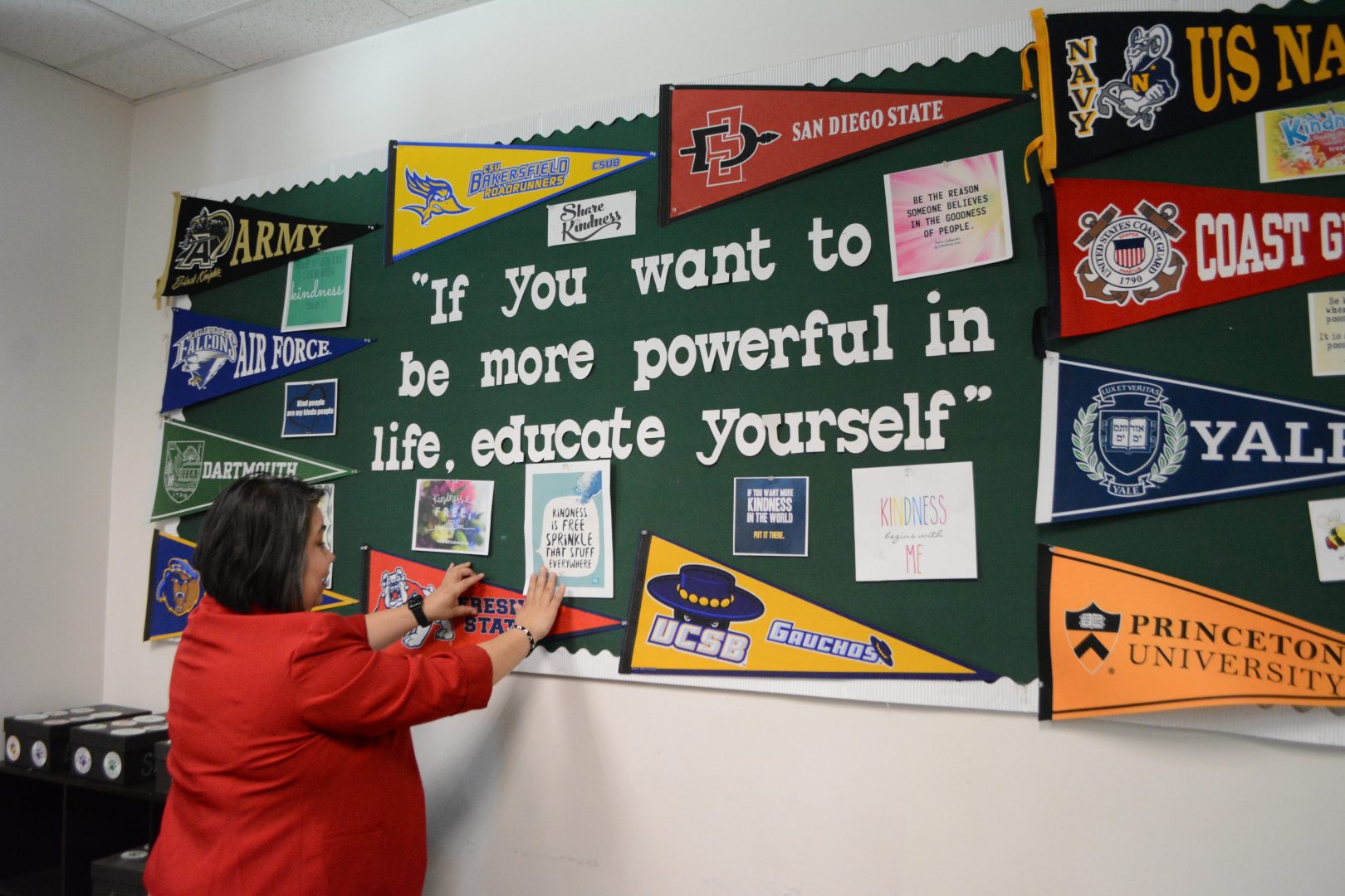 Lead Counselor Alma Lopez adding college flag to a bulletin board, Livingston Middle School, Livingston, CA.